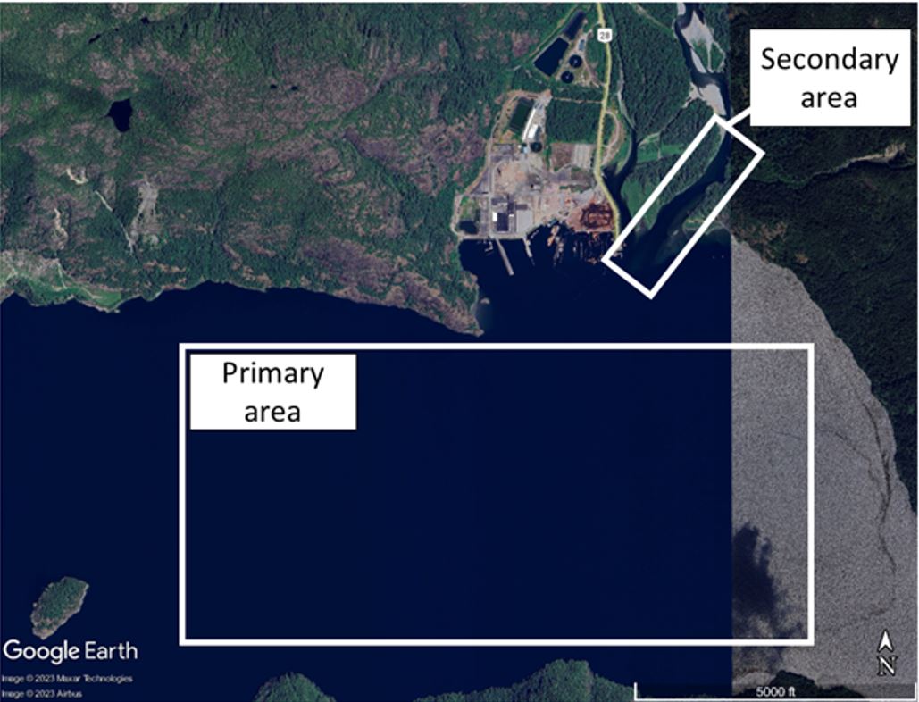 When the sea state is undesirable, the operator’s recommendation for takeoff and landing is to use the southwest portion of the Gold River mouth (marked as the secondary area in Figure 2), which provides approximately 1700 feet of surface. This secondary area may be shielded from the winds affecting the inlet, but the winds aloft in this area, as noted by the operator, have been observed to be unpredictable (Figure 2).