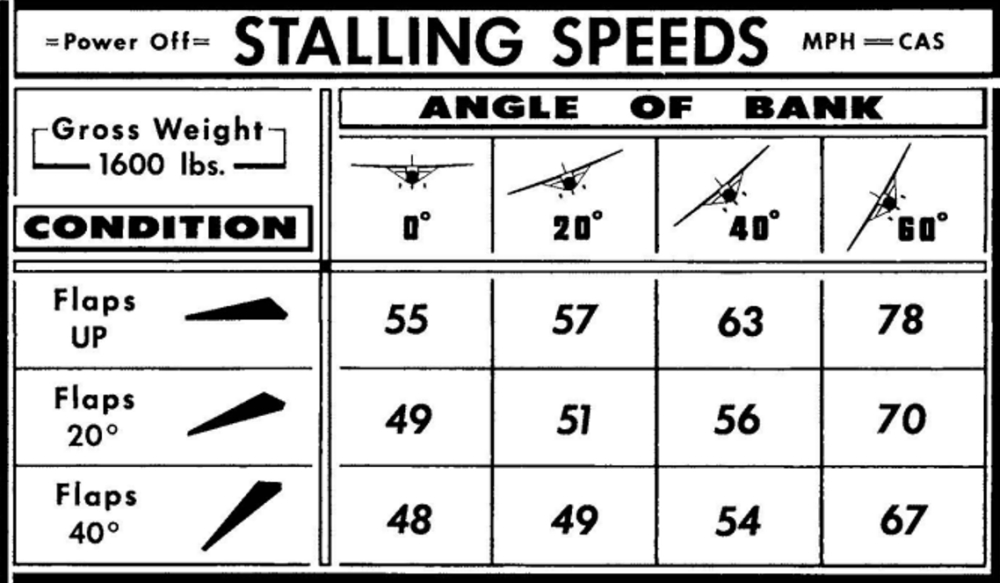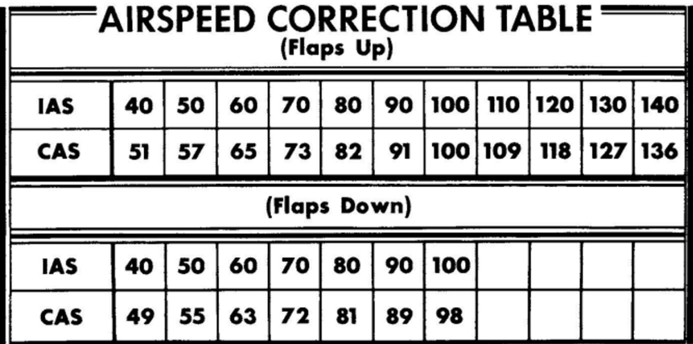 The stall speed varies based on several factors such as the aircraft’s angle of bank and flap position. The Cessna Model 150 Owner’s Manual contains the calibrated stalling speedsFootnote 11 (CAS) when the aircraft weighs 1600 pounds and power is off (Figure 3) as well as an indicated airspeed (IAS) correction tableFootnote 12 (Figure 4).