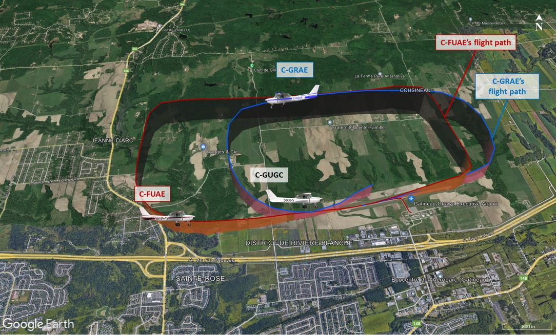 On the evening of the occurrence, when C-FUAE was on final approach and C-GRAE was on the base leg, their tracks were converging for a brief period. However, once C-GRAE was on final approach, it was above C-FUAE, which was no longer visible from the perspective of C-GRAE’s cockpit.