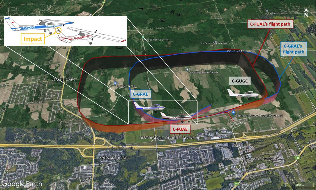 A few seconds later, C-GRAE was directly above C-FUAE. At approximately 2145, when it was between 100 and 200 feet above ground level (AGL), C-GRAE struck the top of C-FUAE’s rudder and its vertical stabilizer (Figure 2).