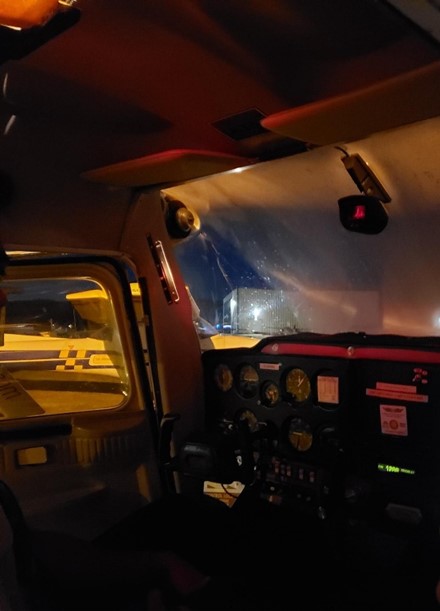 At 2145:06, following the impact that was felt by the 2 pilots, the pilot of C-FUAE announced that he was going to land and stop, without stating a reason. The pilot of C-GRAE conducted a go-around, reported on initial climb, and said he was also going to conduct a full-stop landing. He then reported on the downwind leg and base leg, stating once again that he was going to conduct a full-stop landing. Just after the pilot of C-GRAE’s call on final, the pilot of C-FUAE, who was on the ground and had discovered that his aircraft was damaged, warned the pilots of the 2 aircraft still in flight to be careful on final approach because something had struck his aircraft, but he did not know if it had been a bird or something else. The pilot of C-GRAE did not acknowledge this communication and conducted 9 other touch-and-go manoeuvres, continuing to call in as usual. The pilot of C-GUGC landed and came to a full stop at 2249, followed by C-GRAE at approximately 2309.