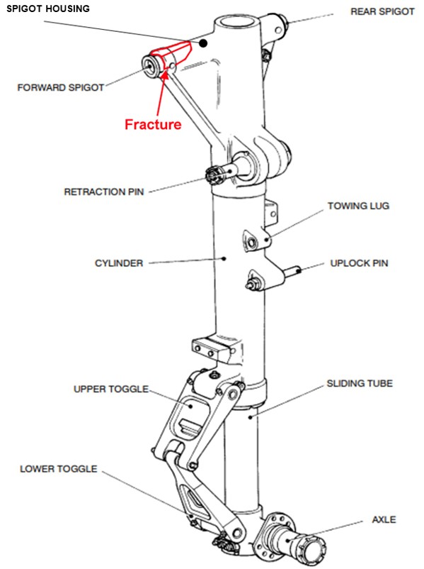 - During the aircraft’s landing, several cracks in the spigot housing of the left main landing gear unit grew, to the point where the structure of the main landing gear unit failed. The cracks likely propagated because the material used was susceptible to stress corrosion cracking, and it was exposed to both tensile stress and a corrosive environment.