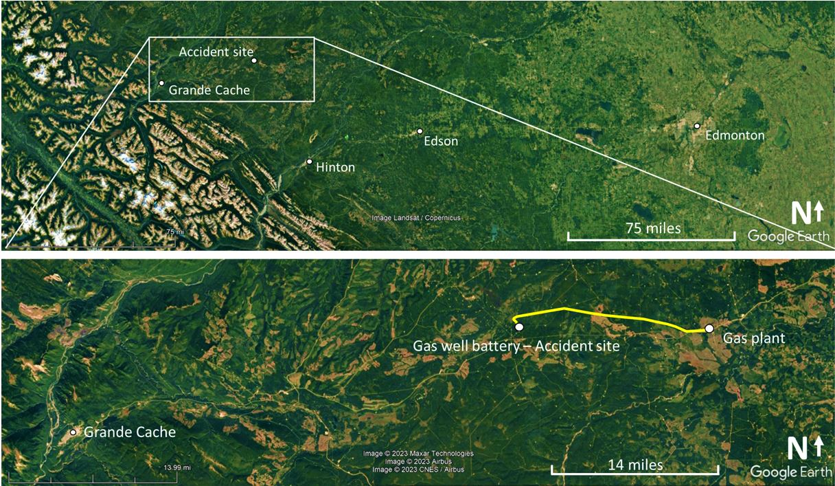 At 0919Footnote 1 on 25 August 2023, the Robinson Helicopter Company (RHC) R44 II helicopter (registration C-GNEC, serial number 11577) operated by Synergy Aviation Ltd. departed the company’s remote base, a gas plant, approximately 46 nautical miles (NM) east-northeast of Grande Cache, Alberta. The purpose of the flight was to pick up an empty cargo net at a multi-gas well battery,Footnote 2 approximately 13 NM west of the base. From there, the helicopter was to fly to another gas-well battery to retrieve pipeline integrity gauges and then return to the 1st battery (Figure 1).