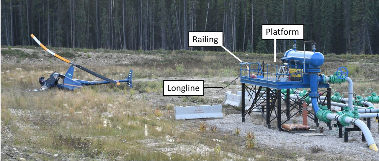 When investigators arrived at the accident site, the lanyard that had snagged on the railing of the work platform was still attached (Figure 4). There was little damage to the front of the helicopter. The helicopter had impacted the ground on its right side. The main rotor blades were distorted from impacting the ground while turning. The fuselage was significantly damaged. There were no signs of pre-existing mechanical problems with the helicopter.