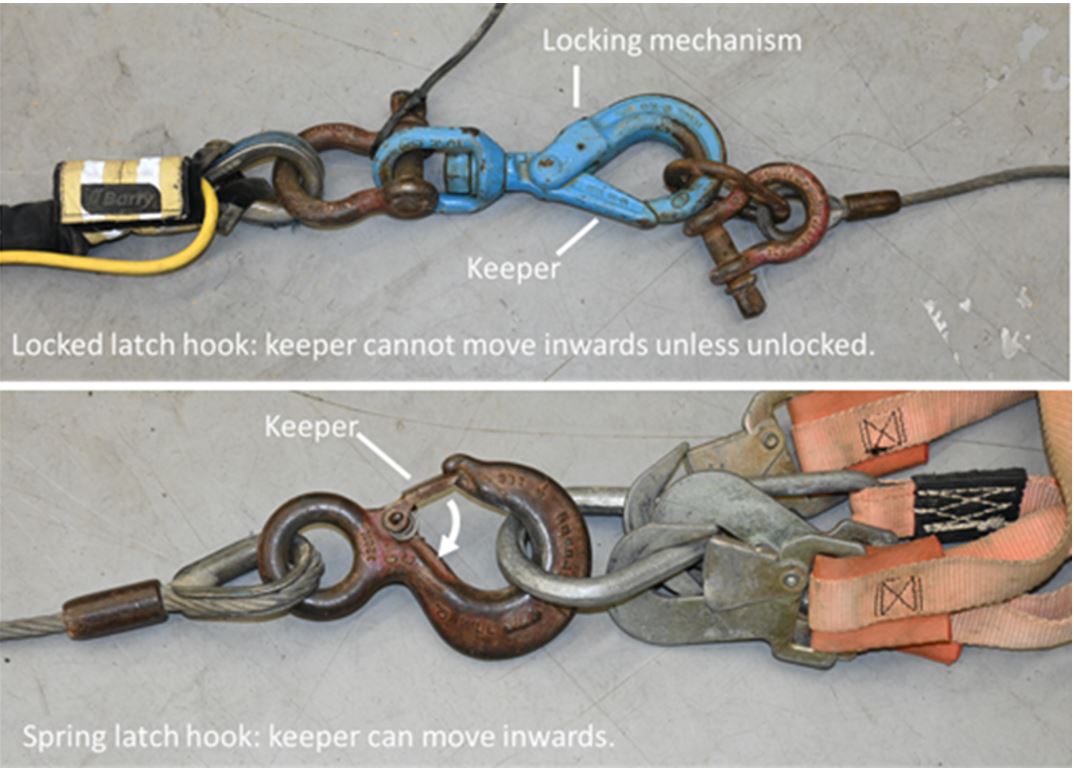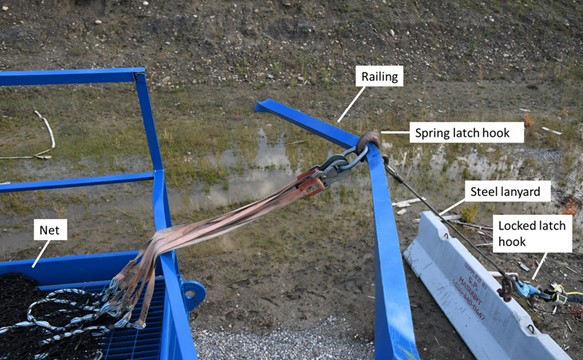 The longline was equipped with a locked latch hook. This type of hook has a locking mechanism that prevents the hook’s keeper from opening, which can mitigate the risk of snagging (Figure 3, top image). The end of the steel lanyard that was attached to the locked latch hook had a spring latch hook installed (Figure 3, bottom image). This type of hook does not have a mechanism to prevent the hook’s keeper from opening, and this is the hook that became snagged on the platform’s railing.