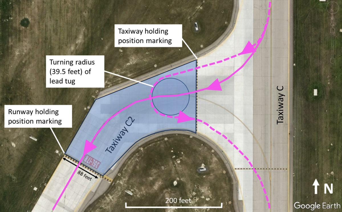 At this time, the lead tug was positioned close to the Runway 17R runway holding position marking on Taxiway C2. The driver of the lead vehicle had never turned around on a taxiway before and believed this was not allowed. In the absence of an explicit instruction to turn around in the ground controller’s last communication, the lead driver also believed that doing so on Taxiway C2 to join Taxiway C would not be possible because he perceived that there was not enough space for both vehicles to turn around, given each vehicle’s turning radius (Figure 2).