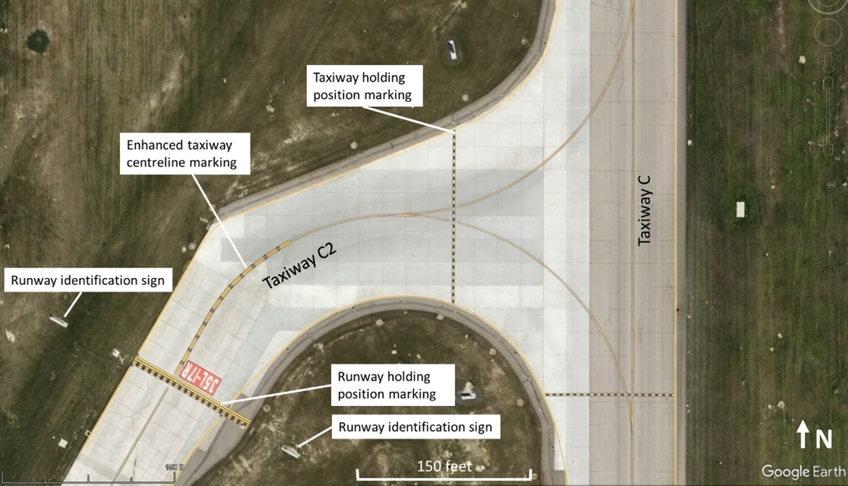 The runway holding position marking used on Taxiway C2 is of the pattern A varietyTransport Canada, TP 312E, Aerodromes Standards and Recommended Practices, 5th Edition (revised 15 January 2020), Section 5.2.16: Runway-Holding Position Marking, Figure 5-12: Runway-holding position markings, page 114. and features an enhanced taxiway centreline marking leading up to it. In addition, there are runway identification signs, along with elevated runway guard lights, on opposite sides of the runway holding position marking where Taxiway C2 joins with Runway 17R. A red rectangle with the runway designation marking (runway number and letter) painted in white letters is collocated with the runway holding position marking on the taxiway entrance to the runway (Figure 3).