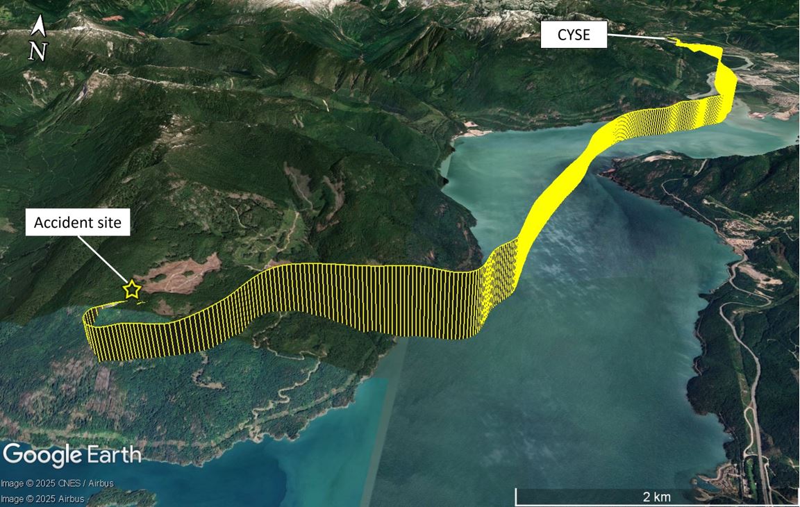 The aircraft departed Runway 15 at approximately 1708.All times are Pacific Daylight Time (Coordinated Universal Time minus 7 hours). It followed the approximate path of the Squamish River southbound, climbing just above 2200 feet above sea level (ASL) before it began a descent. It then flew between 1600 and 1550 feet ASL, making several course changes while travelling southwest.