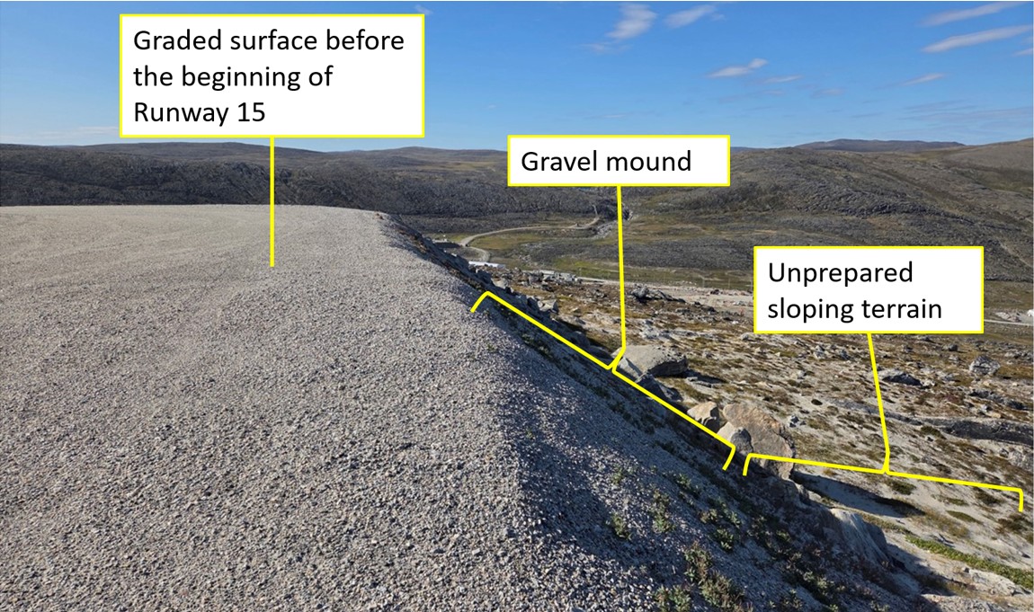 Figure 2. End of Runway 15, including the end of the levelled surface, the gravel mound (approximately 30 feet high), and the unprepared sloping terrain (Source: Third party, with permission, and with TSB annotations)