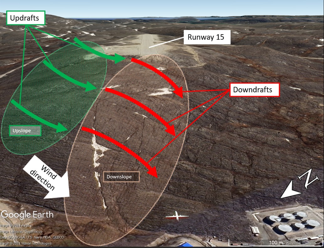 CYKG is located in an area with rocky, uneven terrain. The approach area is subject to downdrafts. At the end of the approach, the negative wind reading detected by the flight data recorder (FDR) confirms that the aircraft encountered a downdraft, which began pushing it toward the ground. The captain reacted by pitching the aircraft’s nose up and increasing power. When the aircraft was 5.5° nose up, the landing gear was approximately 12 feet lower than the pilot’s eyes. Even though this manoeuvre was successful in slowing down the inadvertent descent, it did not stop the descent and was not enough to prevent a touchdown before the start of the runway.