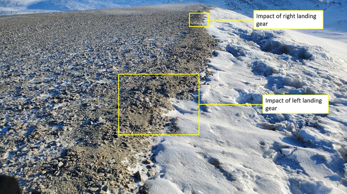 At 1554:33, the main landing gears touched down on the gravel mound that delineates the end of the runway, 220 feet before the threshold (Figure 2). The left wheel touched the ground approximately 5 inches below the runway, and the right wheel touched down approximately 4 inches below the runway.