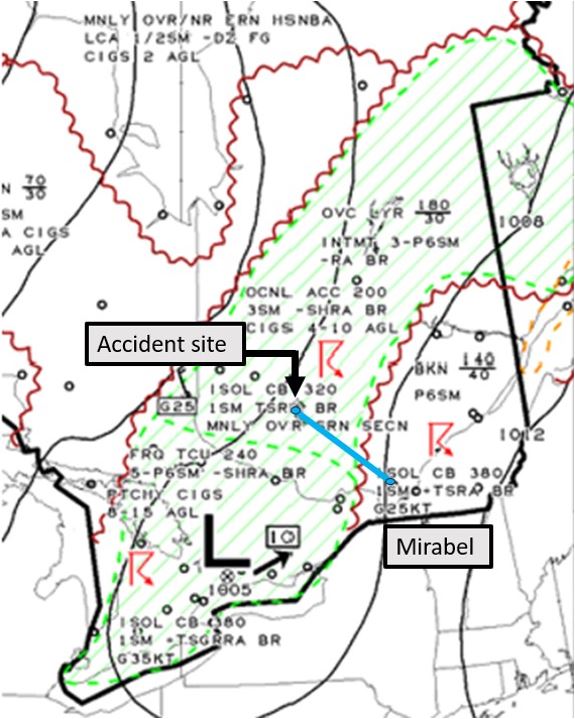 Forecasts for the area along the flight route, available on the graphic area forecast Clouds and Weather Chart (Figure 3) and Icing, Turbulence and Freezing Level Chart, indicated the following conditions starting at 1400 for the planned route: