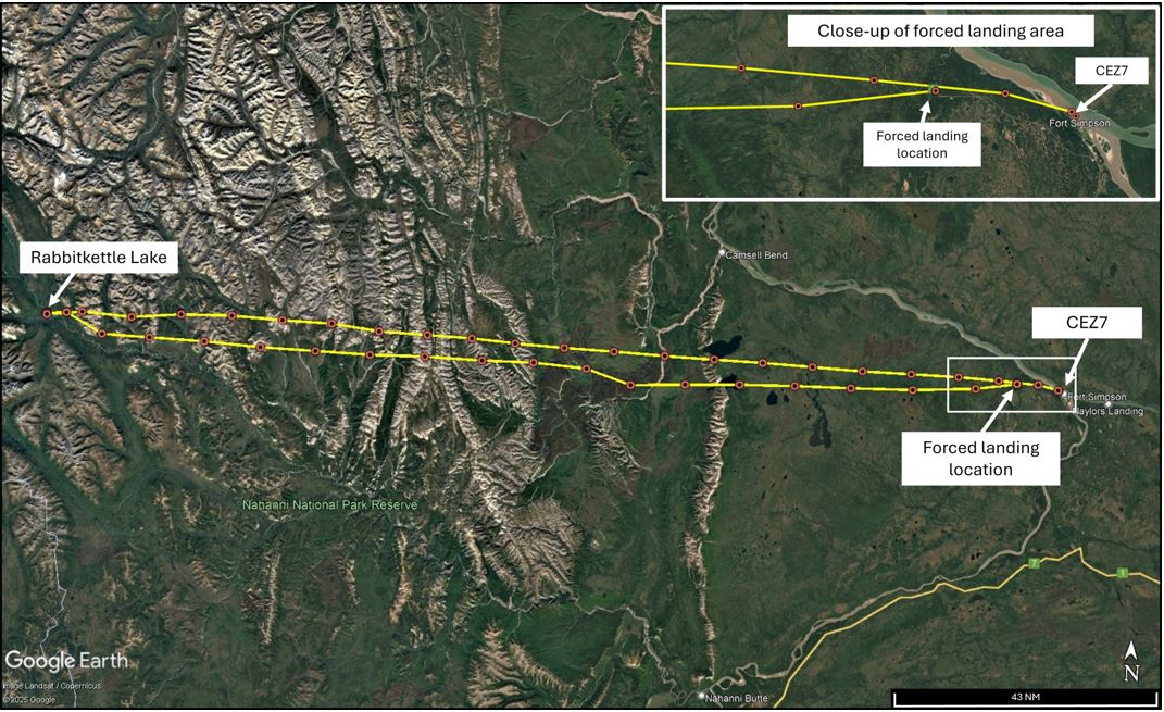 At approximately 1240, the pilot recalled that the fuel gauge showed empty. Again, this happened sooner than he expected. At that point, he began considering options in the event the fuel gauge was accurate. In the absence of other viable options, the pilot turned toward, and followed the Mackenzie Highway in case an emergency landing was required. When the aircraft was approximately 8 NM west of CEZ7 and at around 1500 feet above ground level (AGL), the engineThe engine is a Pratt & Whitney-USA, R-985-AN-14B. experienced a complete loss of power. The pilot was able to carry out a forced landing on the highway, landing at approximately 1250, 7 NM west of CEZ7 (Figure 3).
