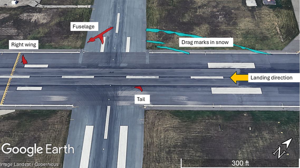 The aircraft went off the right side of the runway into the snow-covered grass area and came to a rest on Runway 15L, near the intersection with Runway 23, about 75 feet beyond the right edge of Runway 23 (Figure 1). The right wing, including the right MLG, became fully detached from the aircraft and slid approximately 215 feet further along Runway 23.