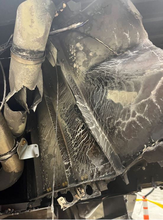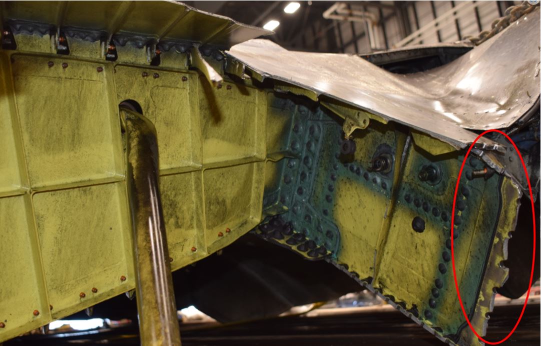 The fuel tank is integrated into the wing. As a result, when the right wing broke off, fuel spilled out of the wing and ignited. There was significant fire damage to the wing, and the right-wing fuel balance pipe, which is located inside the right wing, had a damaged sidewall that was deformed outwards (Figure 7).