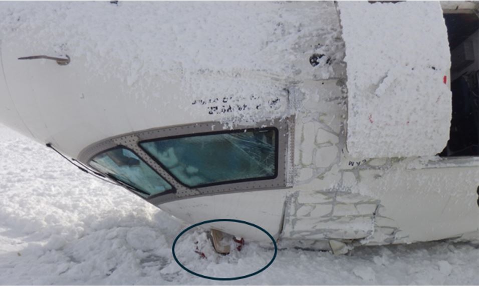 The crew and the passengers began evacuating; however, the deformation of the forward fuselage coupled with the flight attendant jump seat position prevented the flight deck door from opening after the accident. As a result, the pilots used the escape hatch on the cockpit ceiling (which was upside down) to evacuate. The hatch opening was close to the ground, which impeded the evacuation; however, with help from a passenger, the pilots were able to egress (Figure 9).