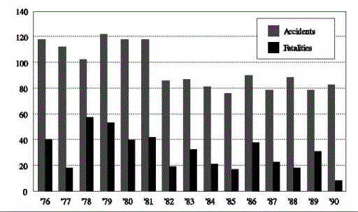 Between 1976 and 1990, there were 1,432 seaplaneFootnote 2 accidents in Canada. During this period, 452 people died in 234 seaplane accidents. Figure 1 shows the seaplane accident experience by year.Footnote 3