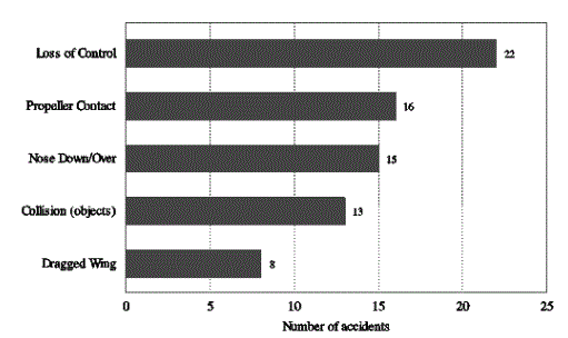 During the standing and taxiing phase, most accidents involved losses of control, propeller contacts, nose down/over, and collisions. As far as serious accidents (not on graph) are concerned, 15 resulted from propeller contact, 3 from nose down/over, and 2 from loss of control.