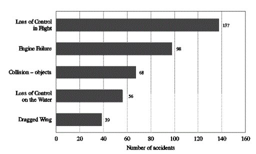 The most frequent types of serious accidents during take-off were loss of control in flight (47 accidents), engine failure (31 accidents), and collision with objects (16 accidents). Loss of control on the water surface and dragged wing were also frequent on take-off, but seldom resulted in serious or fatal injuries.
