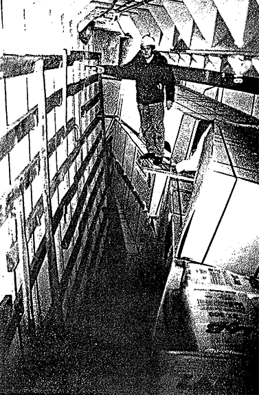 'tween-decks were found jammed together and leaning to starboard, leaving a space on the port side, along the ship's side, which varied from 0.5 m to 1.5 m in width. The lumber and containers on the deck had not shifted.