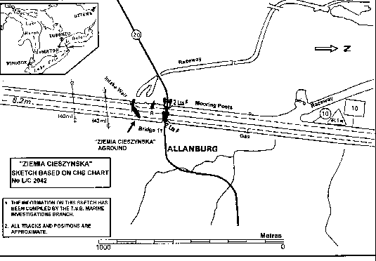 After the grounding and with downbound traffic stopped, the "ZIEMIA CIESZYNSKA" was directed to proceed to Wharf No. 10, a berth outside the Seaway channel, because of her deepening forward draught.