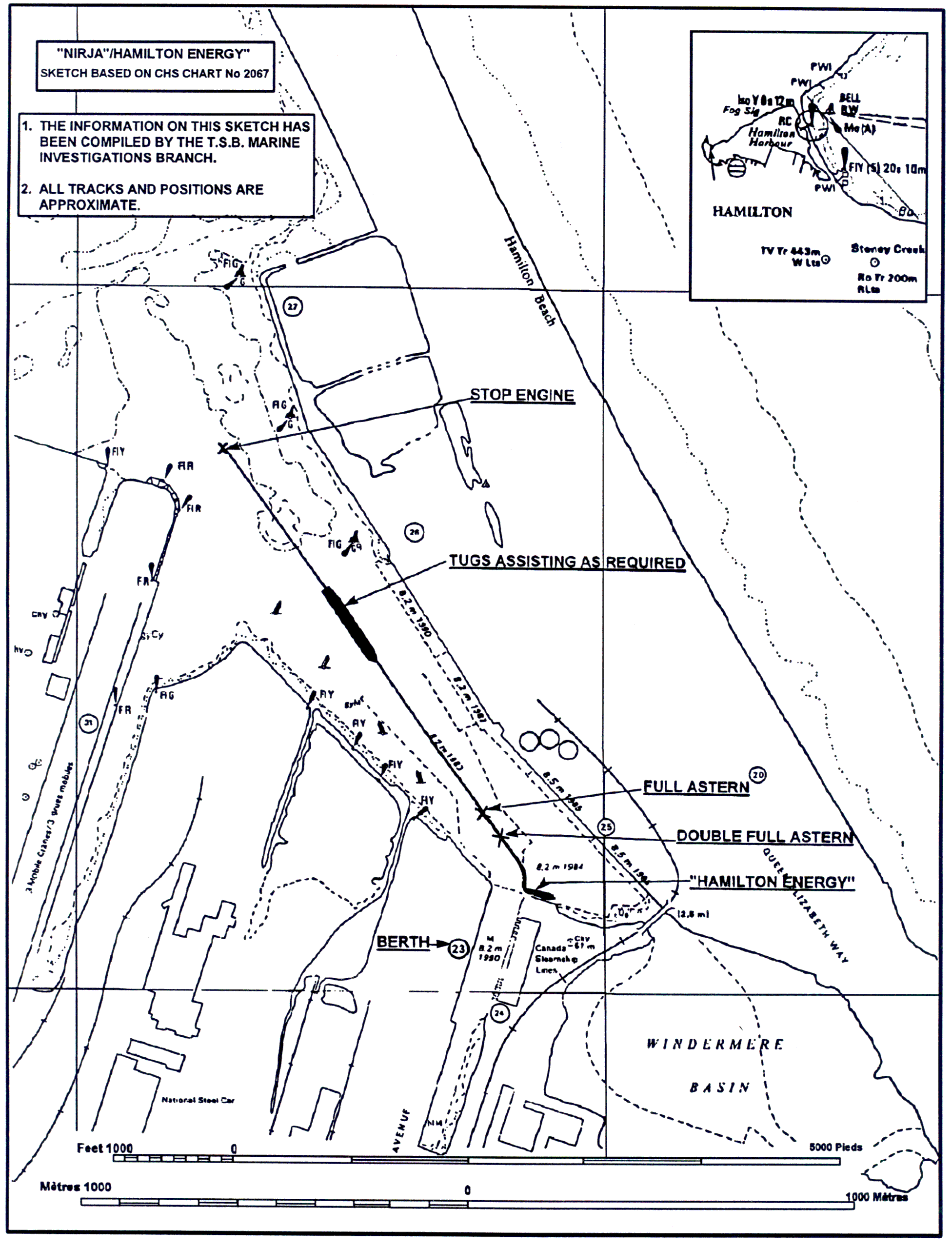 On 11 December 1993, the bulk carrier "NIRJA", carrying a partial load of steel, was attempting to berth at a slip in Hamilton Harbour, Ontario. While turning off the entrance to the slip in strong stern winds and with three tugs assisting, the "NIRJA" did not successfully negotiate the turn and struck the tanker "HAMILTON ENERGY" which was moored alongside the oil barge "PROVMAR TERMINAL I" at the entrance to the slip. There was no injury or pollution, but the wharf and the vessels involved sustained some damage.