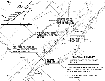 On 16 April 1993, the "CANADIAN EXPLORER" was en route from Port Cartier, Quebec, to Hamilton, Ontario, with 23,870 tonnes of iron ore. On board were 22 crew members, including the master. There was a change of pilot at Québec, Quebec, at 0330 Footnote 3. After a cursory exchange of formalities between the pilot and the master, the latter left the bridge for his cabin at about 0350. The bridge was now manned by the officer of the watch (OOW), the helmsman was at the helm, and the pilot had the conduct of the vessel.
