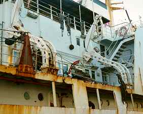 The "IRAN SALAM" is a general cargo with the accommodation, bridge and engine-room amidships. On either side of the accommodation, a lifeboat is hung from gravity davits on roller tracks.