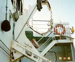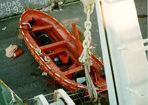 The ship's log indicates that the starboard lifeboat was launched during a drill on 21 October 1993. The entry reads: "At 1000 hrs. stb. lifeboat prepared and lowered to water level. All moving parts checked and greased; also limit switches tested and found in good working condition."