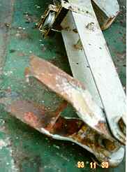 Analysis of the connection metal plates indicated that, in way of the point of failure, the two plates comprising the after connection were 1.03 mm and 1.12 mm thick, respectively, and those comprising the forward connection were 1.48 mm and 1.84 mm thick, respectively. These metal plates are normally 0.952 cm thick. The failure of the forward and after connections occurred 7.62 cm from the lifting hook base plate. In addition, discoloration was observed on the inside surface of the lifeboat, indicating an accumulation of water in the bilges, which could have contributed to the corrosion at the base of the connections.