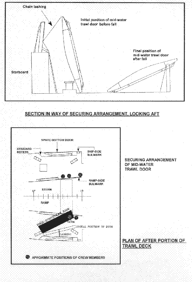 The mid-water trawl doors were reportedly stowed upright, with one side resting on the deck at a slight angle to the ship-side bulwarks. The stowage arrangement is depicted in Appendix A. The doors were secured by means of a chain which led from the end of the centre web of the door over the upper edge of the door and down to the chain securing the spare bottom trawl door in the bulwark recess. No turn-buckle or other tightening device was incorporated in the securing chain and there was no chocking arrangement to secure the lower edge of the door which was in contact with the deck. Scratch marks were noted on the deck in the area. Coupling links were used for all securing chain connections. During the investigation, the securing chain and the coupling link used in the connection to the bulwark were recovered, but all parts of the coupling link used in the connection to the trawl door were missing.