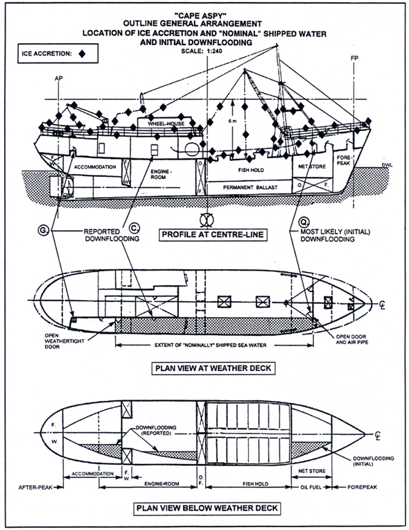 One week had been spent in port during which time some minor servicing and repair work had been carried out. The vessel's trim and stability was similar to that at the start of many previous fishing trips, giving no cause for concern. The "CAPE ASPY" was upright with a full amount of diesel fuel oil, (potable) water and stores as well as the usual amount of catch preservation ice stowed and secured in the forward part of the fish hold. After departure, the mooring ropes were stowed in the net store (forward store hold) and all loose items on deck were checked and found secured.
