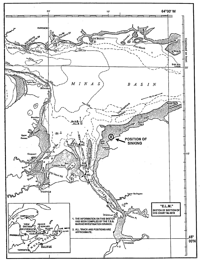 The tidal ranges in the northern part of the Bay of Fundy (Minas Basin) are among the highest in the world. In the area of the sinking, the range for the falling tide on which the "E.L.M." sank was estimated to be about 11.4 m (37.3 feet), with high water occurring at about 0210 and low water at about 0815.