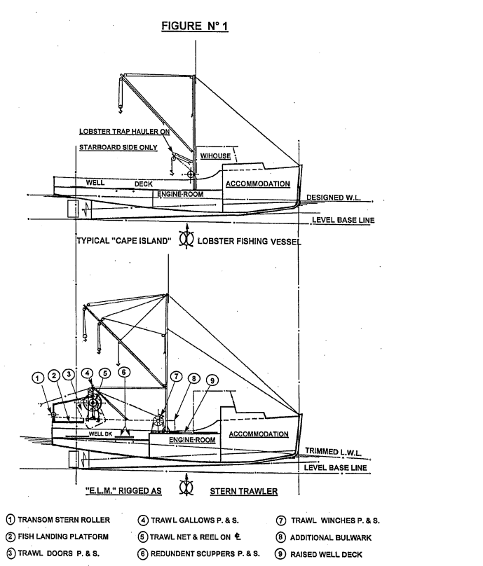 Inspection of other similar "Cape Islander" vessels at nearby harbours revealed that eight vessels had been equipped for operation as small stern trawlers in the flounder fishing industry. The majority were somewhat larger vessels than the "E.L.M.". All were fitted with only one trawl winch and none were equipped with the powered net reel installed aft on the "E.L.M.". The unloaded freeboard and trim of these vessels were not significantly affected by their conversion to stern trawling. Because their original well decks, on which the additional but lighter gear was installed, had not been raised, their reserve buoyancy and transverse stability characteristics were less adversely affected than was the case with the "E.L.M.".