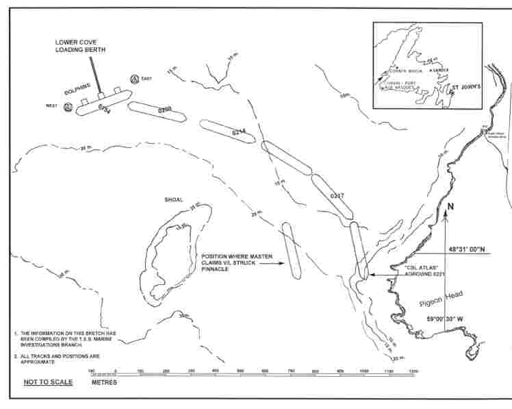 The "CSL ATLAS" departed from Lower Cove, Newfoundland, bound for New York, U.S.A. The master did not engage the services of a pilot for the departure. Shortly after, the vessel grounded 1.1 cables west of Pigeon Head. The "CSL ATLAS" jettisoned 5,645 tonnes of cargo and was refloated later the same day. The vessel sustained extensive damage to the underside portion of the hull; three compartments were holed. There was neither pollution nor injury as a result of this grounding.