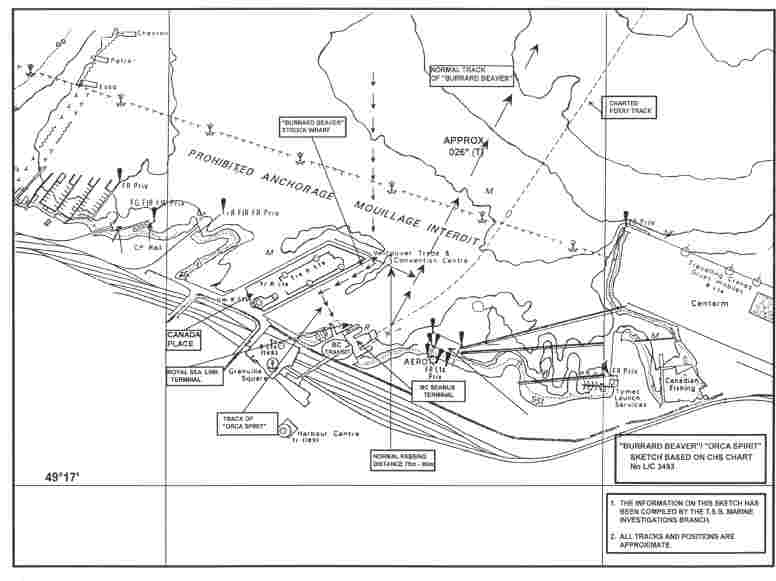 The track the Royal Sea Link vessel "ORCA SPIRIT" generally followed as she approached her berth is reproduced on the chartlet (see Appendix B). This ferry from seaward and First Narrows approaches the north-west corner of the Canada Place dock, then proceeds on a course parallel to the north face of the dock. She then rounds the north-east corner, staying close to the eastern side of the Canada Place dock after which she turns in the basin and approaches her berth on the western side of the SeaBus Terminal.