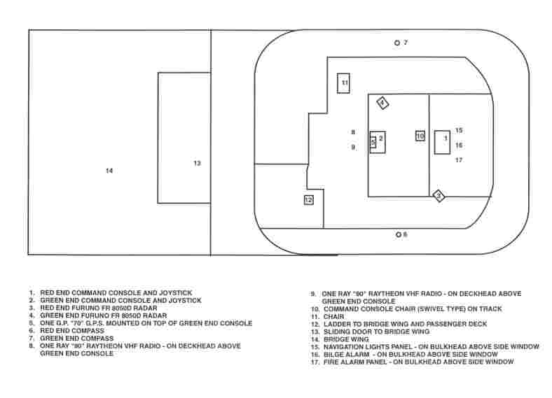 The person who has the conduct of the vessel (operator) sits in the wheel-house on a track- mounted swivel chair, facing the direction of travel, located between and within easy reach of both joysticks (see Appendix C). A vertical screen for radar display and a magnetic compass are mounted in front of the operator. It is the operator's responsibility to ensure that the radar is properly adjusted and visible. Identical units are fitted at both ends of the