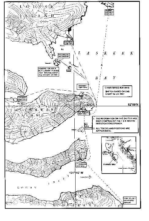 On 30 July 1993, the guides checked the 0545Footnote 2 weather forecast for the area. At 0830, the group departed their overnight campground on the north-east tip of Lyell Island, B.C., and proceeded unhurriedly to an abandoned native village on Tanu Island, B.C., a distance of approximately five miles.