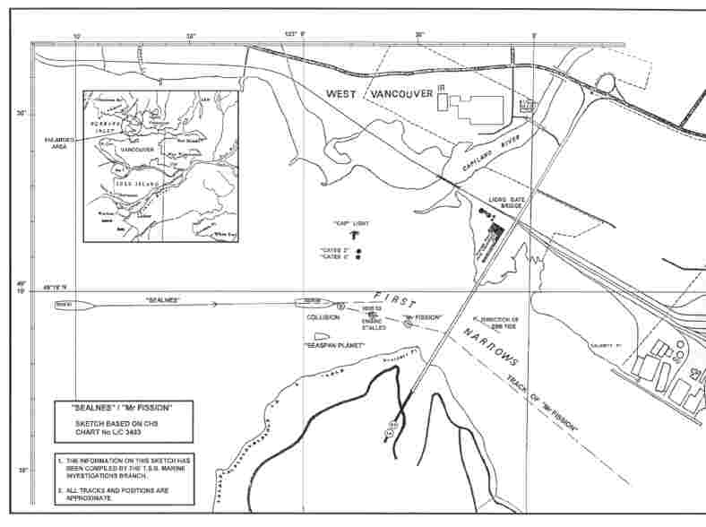 Shortly after midnight on 19 December 1993, in good visibility, the "SEALNES" was approaching the First Narrows, inbound to Vancouver Harbour, when she collided with the "MR. FISSION" which was drifting in the main channel after an engine malfunction. The three crew members of the "MR. FISSION" were promptly rescued by one of the tugs in the area before their capsized vessel sank.