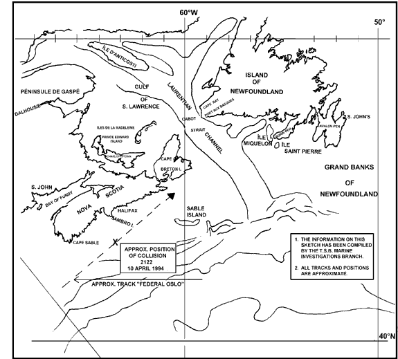 On the evening of 10 April 1994, the "FEDERAL OSLO" was steering a north-easterly course by autopilot and was heading for the Cabot Strait. The visibility had deteriorated during the evening hours and it was reported that the vessel was making the appropriate fog signal. The speed of the vessel was maintained at 13.5 knots (kn) and the master had the conduct. The only other person on the bridge was the officer of the watch (OOW).
