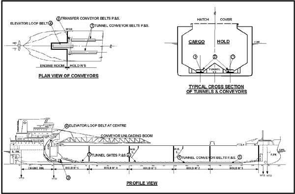 Unloading is accomplished by opening gates at the bottom of the five hopper-shaped holds and allowing the cargo to fall onto two fore-and-aft conveyor belts which transport the cargo to the transfer and loop belt system at the after end of the cargo space where it is raised to the above-deck unloading boom for discharge over the side. The area in which the belts run under the cargo holds and the space at the after end which houses the loop belt are referred to as the "tunnel" and the "loop belt casing", respectively. The unloading team, under the direction of the chief engineer, consists of the chief officer, senior technician, an operator and three tunnelmen. The operator mans the control room at the forward end of the main deck and monitors the cargo on the discharge boom while the tunnelmen operate the hopper gates to regulate the cargo flow as required by the operator and ensure the safe running of the conveyor system. Communication is by means of radiotelephone (R/T) and a signal light system. All decisions to start or stop the unloading system are taken with the approval of the senior personnel.