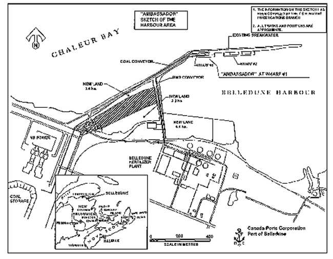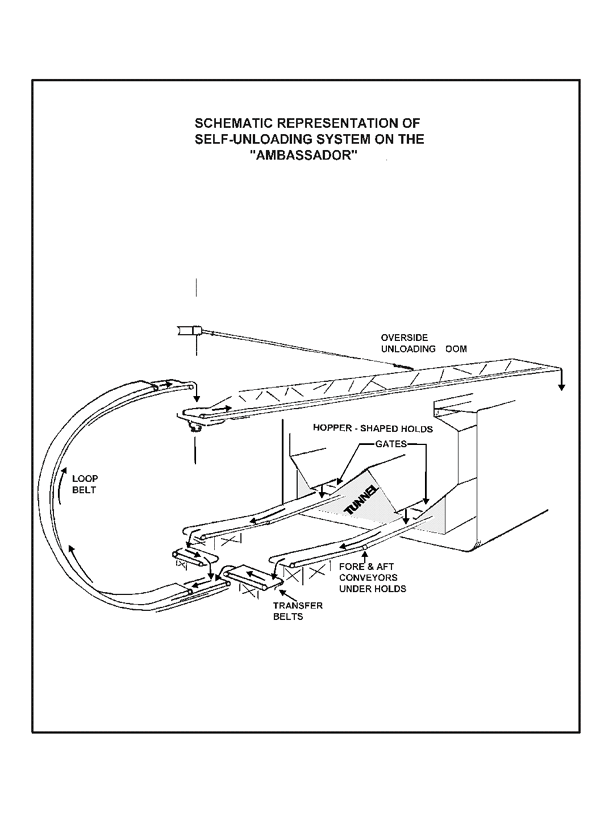 The "AMBASSADOR" is a self-unloading bulk carrier with accommodation and engine-room located aft. The basic layout is as shown in the General Arrangement Plan (Appendix A, Figure 1). The hull is subdivided longitudinally by four transverse watertight (W/T) bulkheads; a collision bulkhead, one bulkhead at each end of the cargo space and one at the after end of the engine-room.