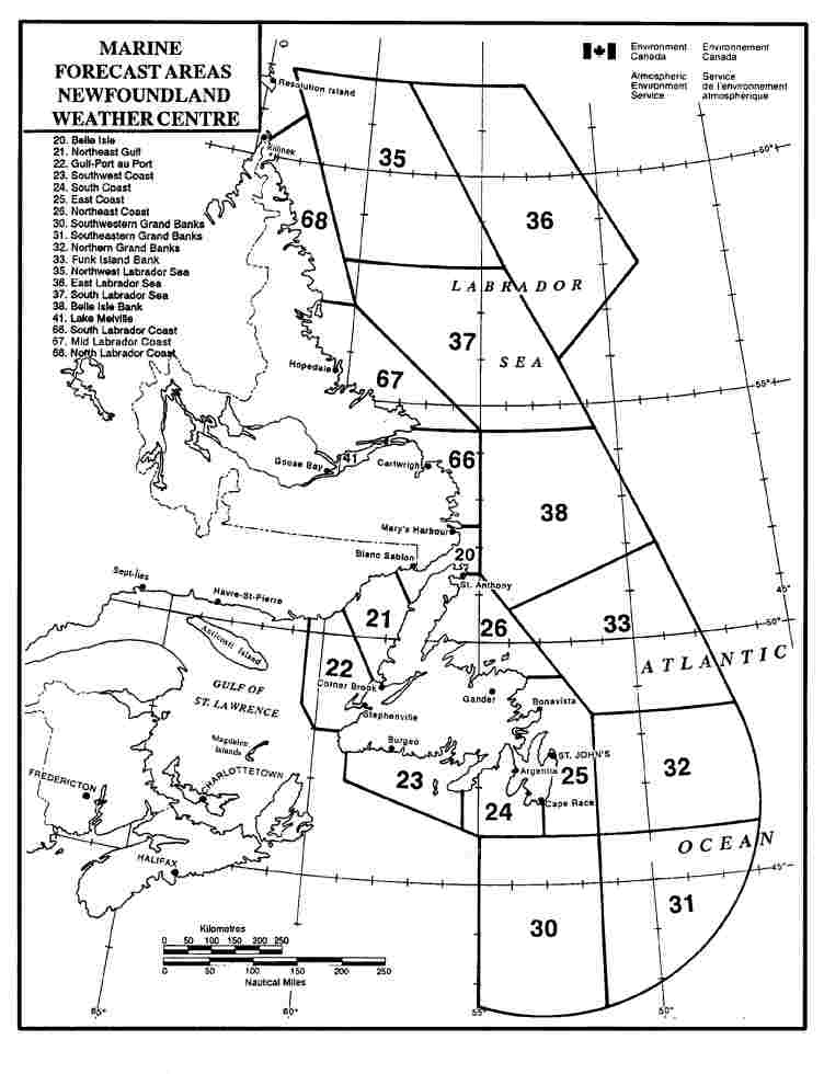 The Newfoundland Weather Centre also issues a sea state forecast. The 0600 broadcast for the East Coast, North-East Coast Marine Areas of Wednesday, 12 October 1994, stated: "Seas 2 to 3 metres building to 5 to 6 metres this evening."