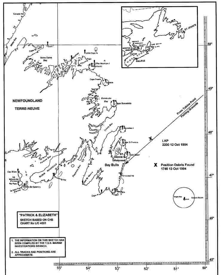 - The loss of the "PATRICK & ELIZABETH" with her crew of five occurred in the approximate calculated position of 47°40'N, 051°54'W, north-east of Bay Bulls, between 2200, 12 October, and 1746, 13 October 1994.