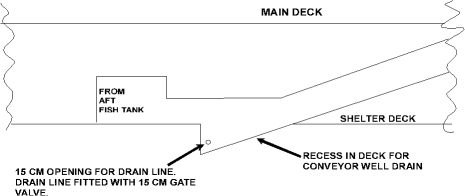 In order to move fish forward from the fish holding tank (20) to the processing conveyors, an enclosed water-flushing chute system was installed. The bottom of the conveyor system is below the shelter deck level in a recessed drain well created for the purpose (Figure 5). This drain well has a ship-side 150 mm overboard drain (gate) valve (photograph 8) to allow the water to run off from the chute/conveyor system. There is neither a non-return valve nor a means to pump out water accumulated in this well. The overboard discharge does not drain the shelter deck nor is it intended to.