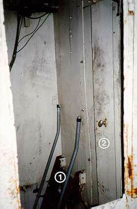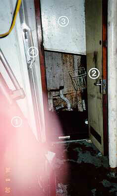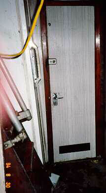 By the time he reached the foot of the ladder (B) leading to the shelter deck, large volumes of water were downflooding from above. He fought his way up the ladder to the shelter deck (photograph 4). At the shelter deck landing, there was about 1 m of water and it was pouring through the open doorway to the accommodation (G). He had to overcome the water pressure to open the door (F) leading to the engine-room (photograph 5).