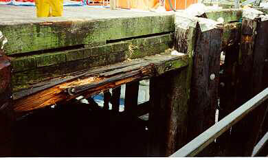 One wale on the dock apron front was broken. The wale and its securing bolts were bent upward by the force exerted against it (photographs 6 and 7).