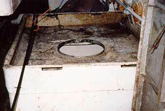 The two ballast/fish tanks (12 and 13) were each fitted with two manholes to provide access for loading and discharging fish. The manhole covers were installed flush with the shelter deck and were each fitted with a single-action locking device. Ventilation to these tanks was provided by a 20 cm-long, 50 mm-diameter pipe coupling welded to the deck at its mid-point, which protruded only 10 cm above the deck (photograph 11).