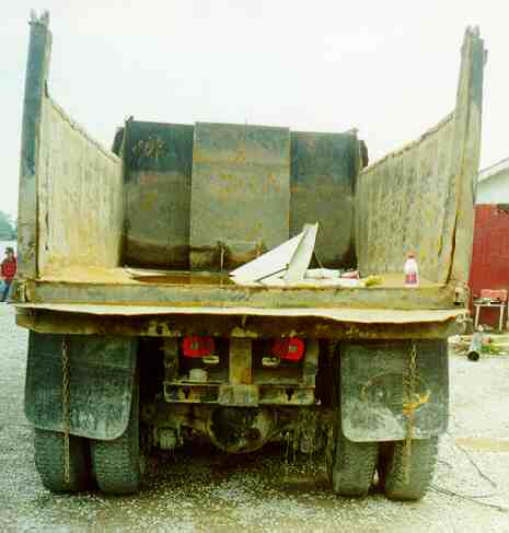 The vehicle is a 1978 International Loadstar 1800 three-axle truck with a tare weight of 7,020 kg and a rated gross weight of 22,800 kg. At the time of the occurrence, the truck was reportedly loaded with 8 tons (8,130 kg) of limestone boulders, for a total laden weight of some 15 tons (15,150 kg). The cargo box of the truck was approximately 4.1 m long, 2.4 m wide, and 0.9 m high, and the tailgate was removed to facilitate dumping the boulders, which were loaded toward its forward end and protruded about 0.5 m above its sides.