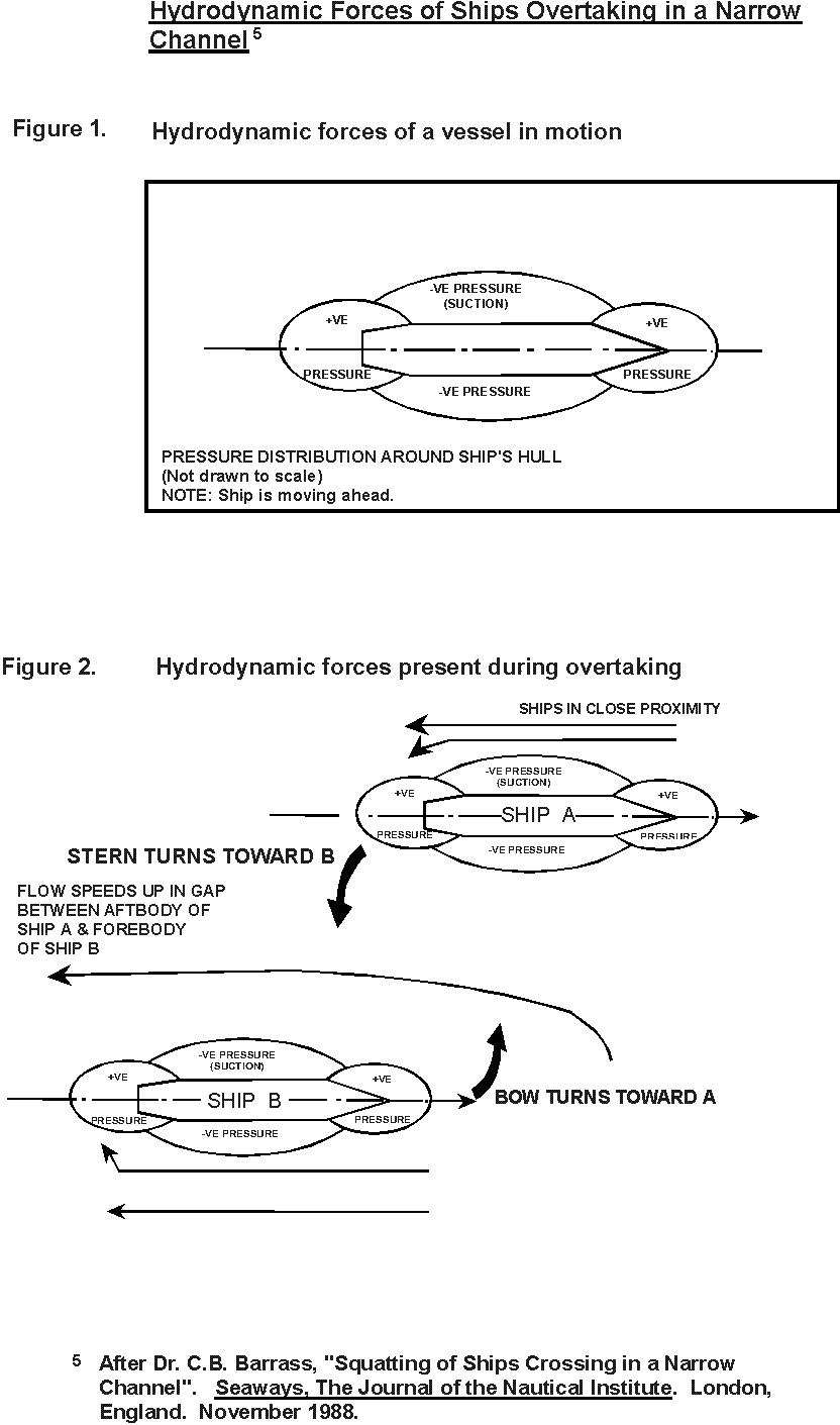 When two vessels are under way on parallel or nearly parallel headings in close proximity to each other (see Appendix A, Figure 2), the above paper states, "any change in the delicate balance of pressure forces acting on the hull will cause ... large longitudinal and lateral forces coupled with powerful turning moments ... applied to the ship. These could give rise to problems in ship handling."